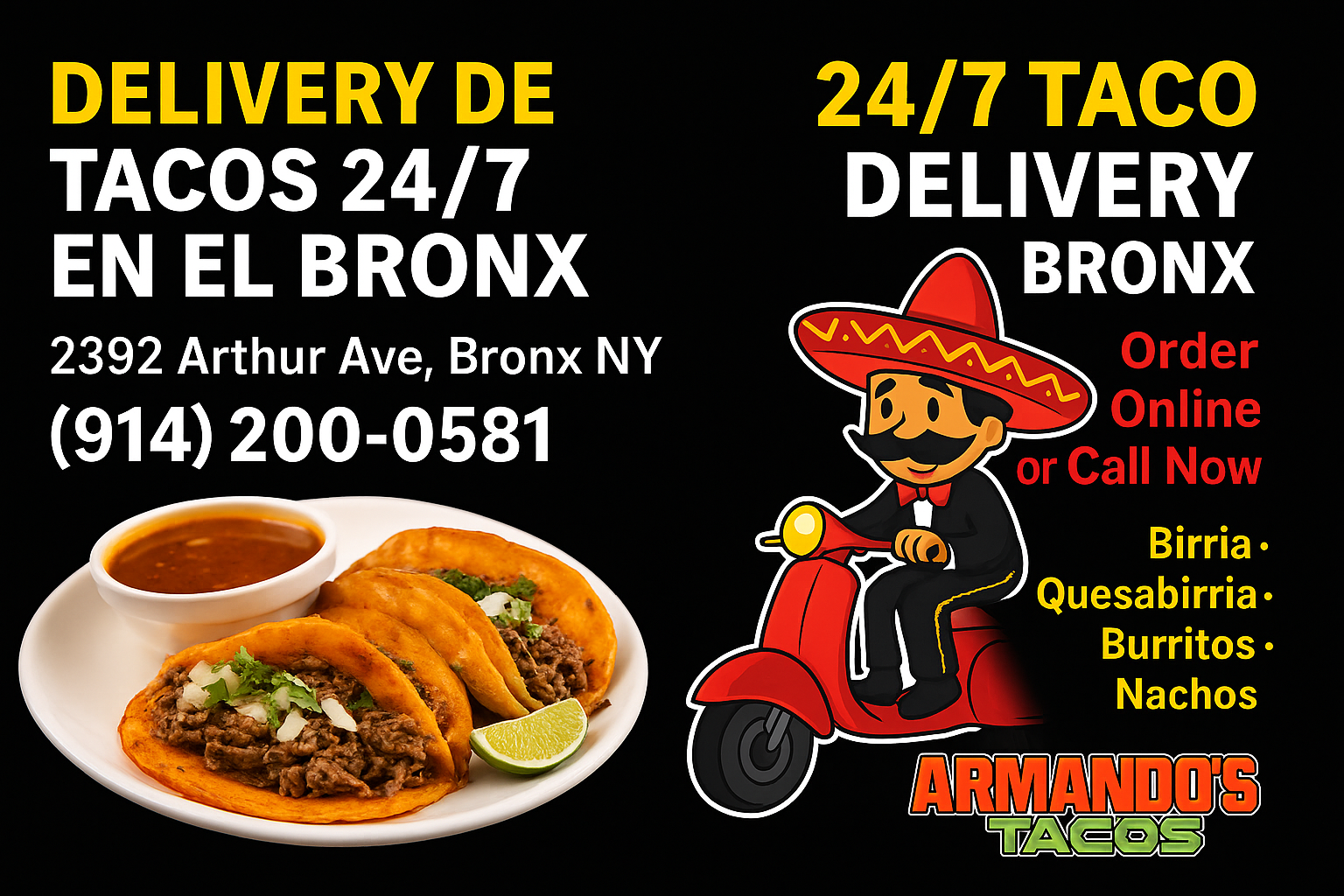 Disfruta de nuestro delivery rápido 24/7 desde Arthur Ave, con tacos calientes a domicilio en minutos.